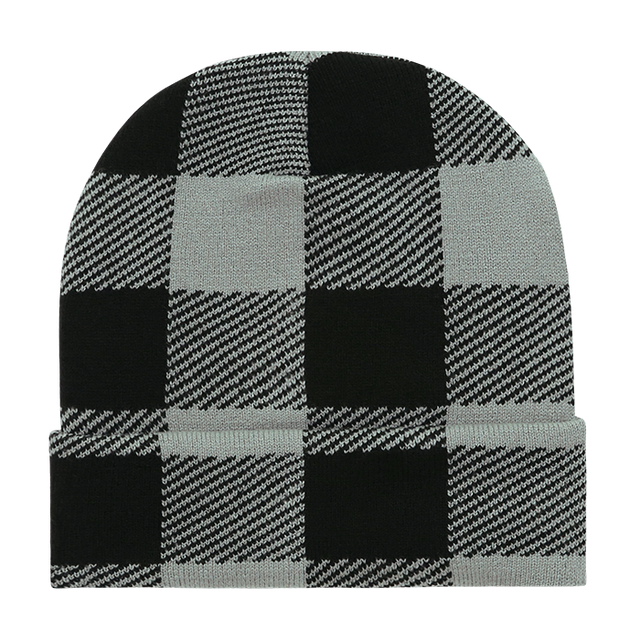 The Long Plaid Beanie is a long, cuffed beanie featuring a plaid design. It's constructed with a tight knit to ensure warmth.
