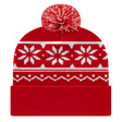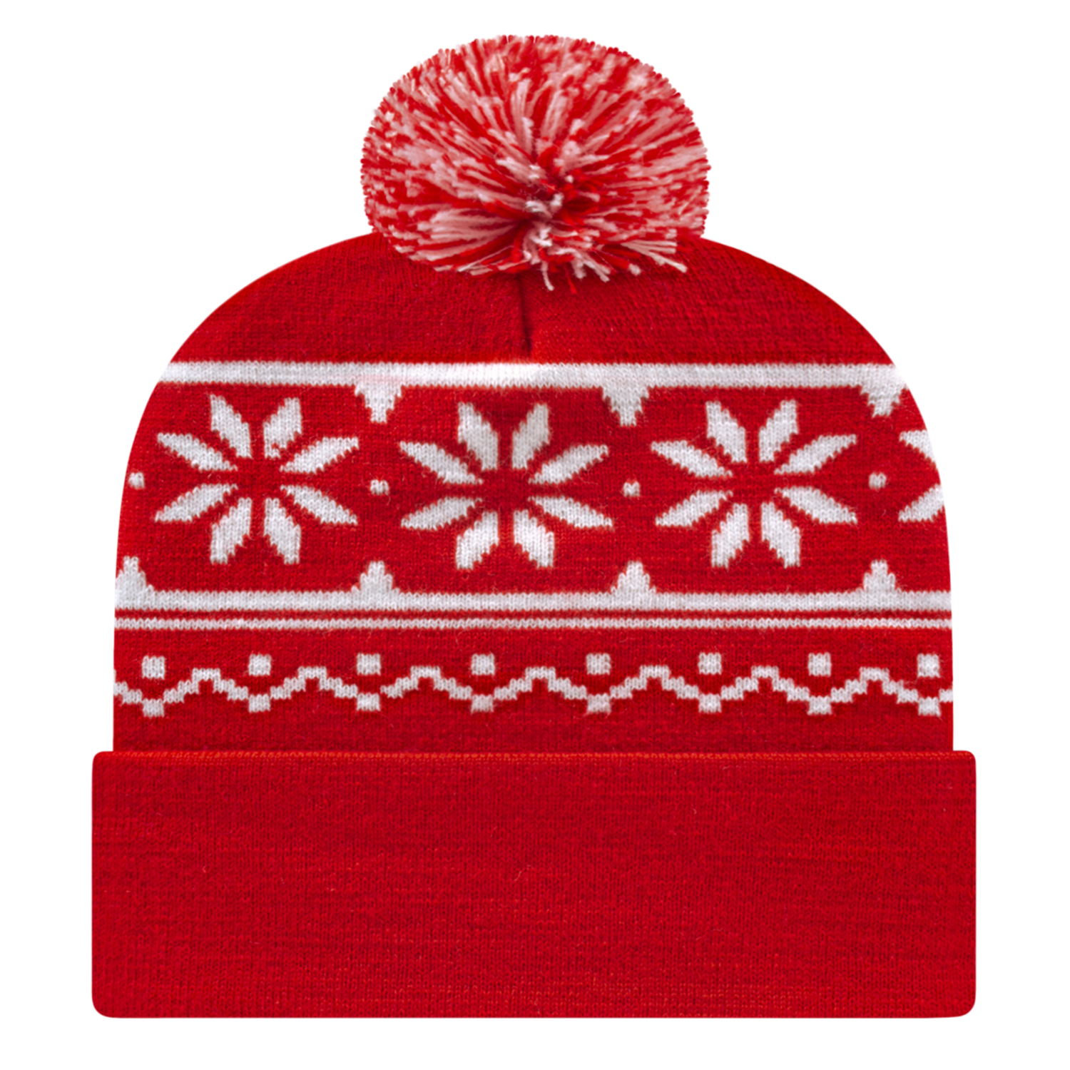 Add some frosty fun to your knit headwear with this snowflake patterned cap. Available in a wintry mix of holiday-inspired colors, this cap is proudly made in the USA of imported yarn. Acrlyic/nylon/spandex blend knit cap with cuff Snowflake pattern throughout crown Solid color cuff with two-color pom Click here to view product video