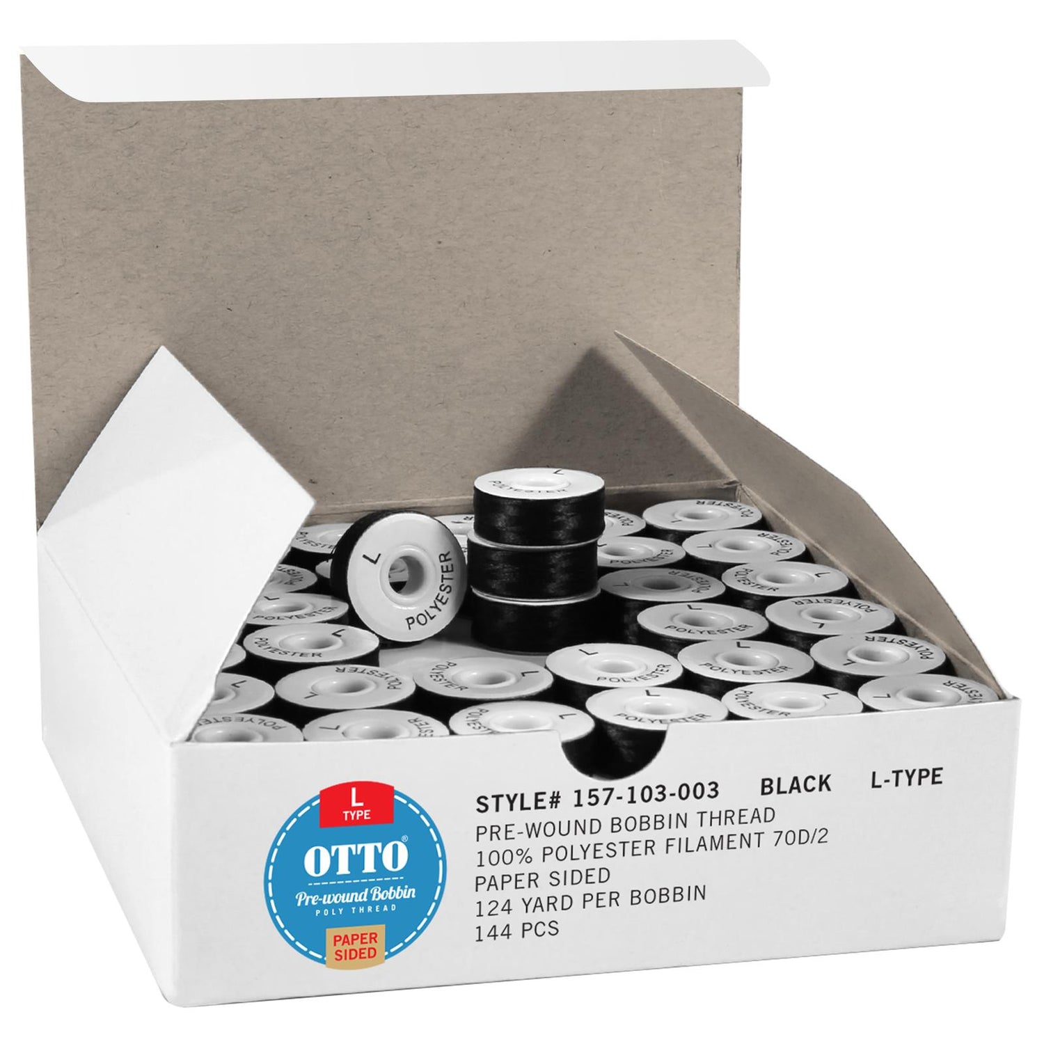 OTTO Embroidery Pre-Wound Bobbin Thread, Perfect for Effortless Embroidery! Reduce Breakage, Knots & Jams!. Pre-Wound Black Bobbin Thread for hassle-free embroidery setup; Saves time and effort by eliminating the need for manual winding; Designed to fit L-Type bobbin cases for hassle-free usage; 124 yards per bobbin for small to medium-sized embroidery projects; 144 pcs per box (not sold separately) ensures ample supply for ongoing projects; Paper-Sided design facilitates easy insertion and removal from bobbin case; Continuous polyester filament thread with a 70D/2 thickness for strength and durability; Crafted from 100% polyester for exceptional durability and color retention