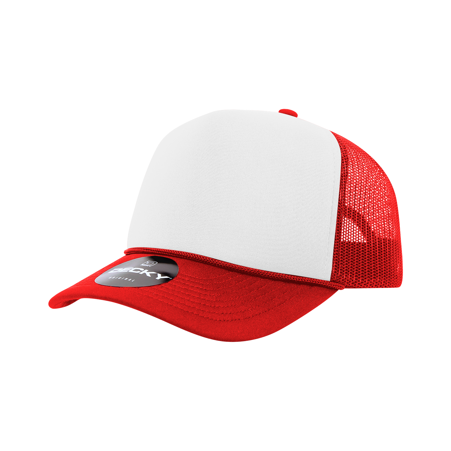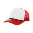 The Two Tone Foam Trucker Hat is a constructed, 5-panel baseball cap with a white foam front and rear colored mesh panels. It features an integrated cotton sweatband, a matching curved bill, and an adjustable plastic snap closure.