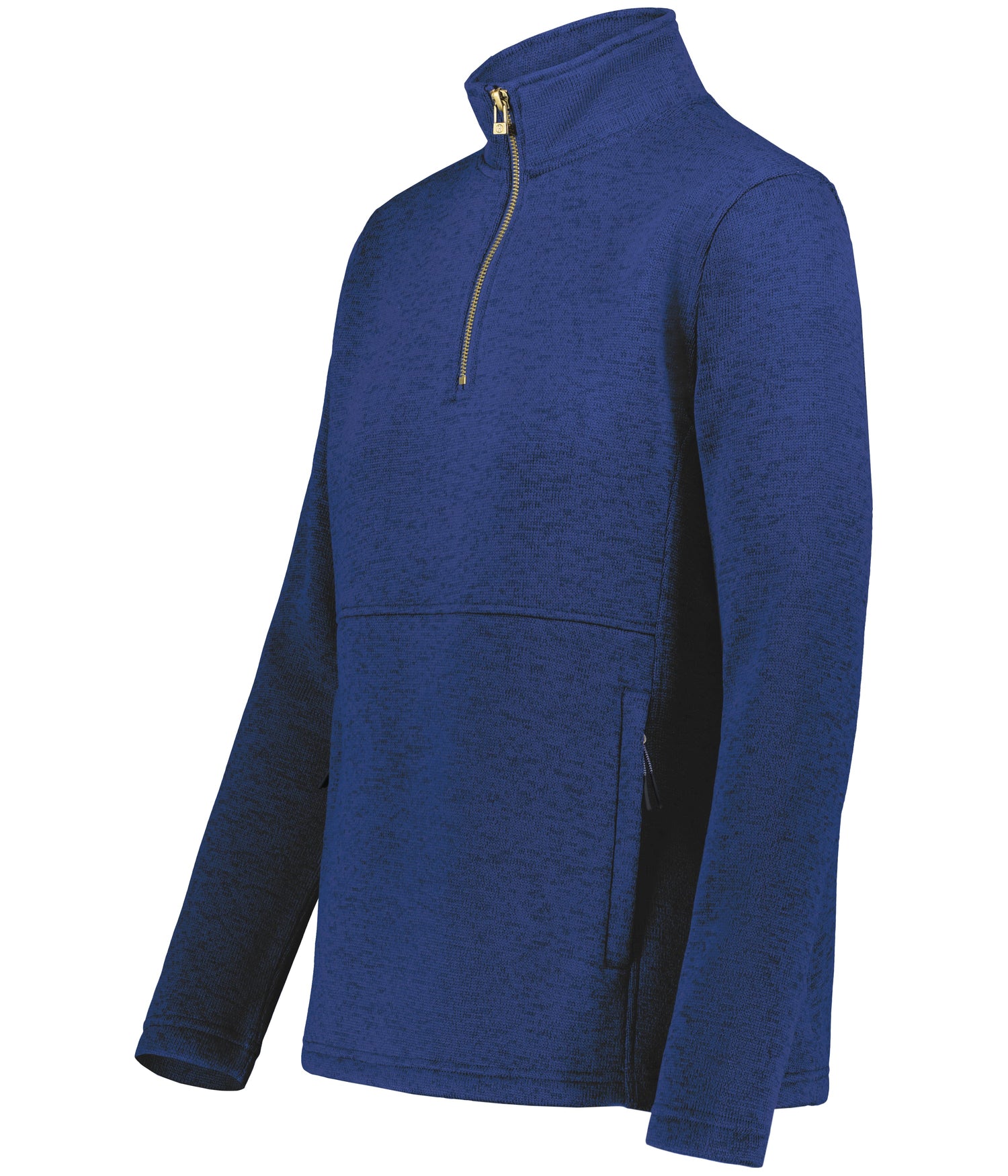 * Eco-Revive® product featuring 80% recycled polyester/20% polyester * Ladies' fit * Hanger loop label * Quarter zip pullover style * Set-in sleeves * Front zippered pockets * Open bottom