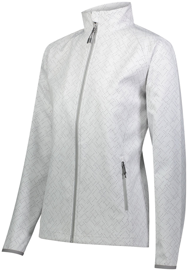 * Featherlight soft shell fabric is 100% bonded polyester with mechanical stretch and durable water-repellent finish to keep you dry * Wicks Moisture * Water-resistant * Ladies' fit * Woven label * Front zipper with outside storm flap and snaps * Raglan sleeves * Front zippered pockets * Dual inside pockets * Spandex bound cuffs * Open bottom with adjustable elastic hidden drawcord
