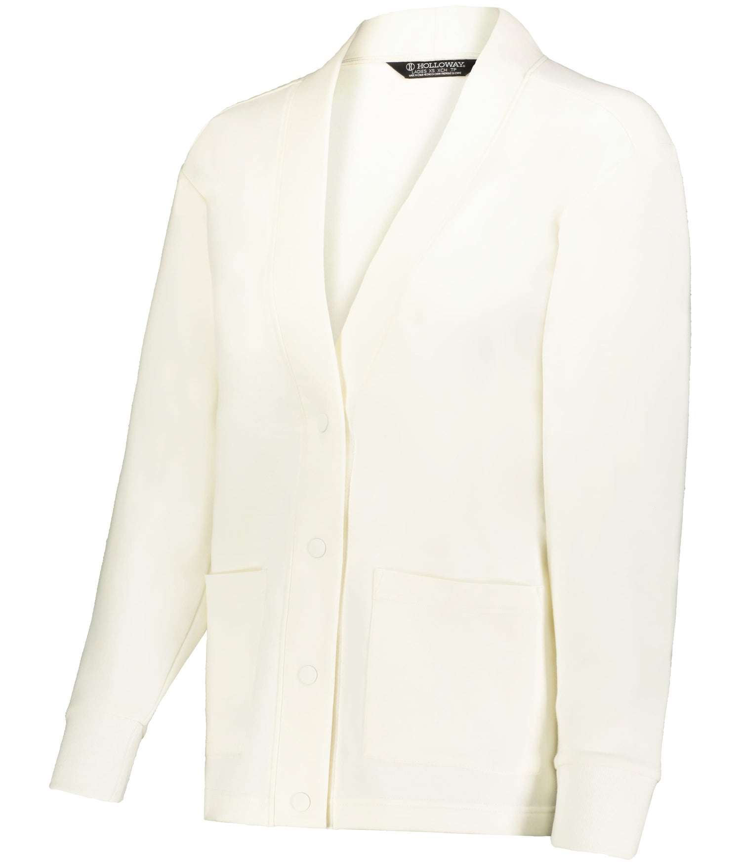 * 9-ounce, 51% polyester/45% cotton/4% spandex sport french terry * Ladies' fit * Hanger loop label * Snap front * Dropped shoulder sleeves for mobility and comfort * Front dual patch pockets * Spandex rib-knit cuffs
