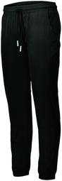 90% polyester/10% spandex, 4-way stretch woven fabric * Ladies' fit * Covered elastic waistband with outside drawcord and silicone dipped tips (inside drawcord on XS-S * Front pockets * Covered elastic cuff at leg opening * Tapered leg - Water repellent