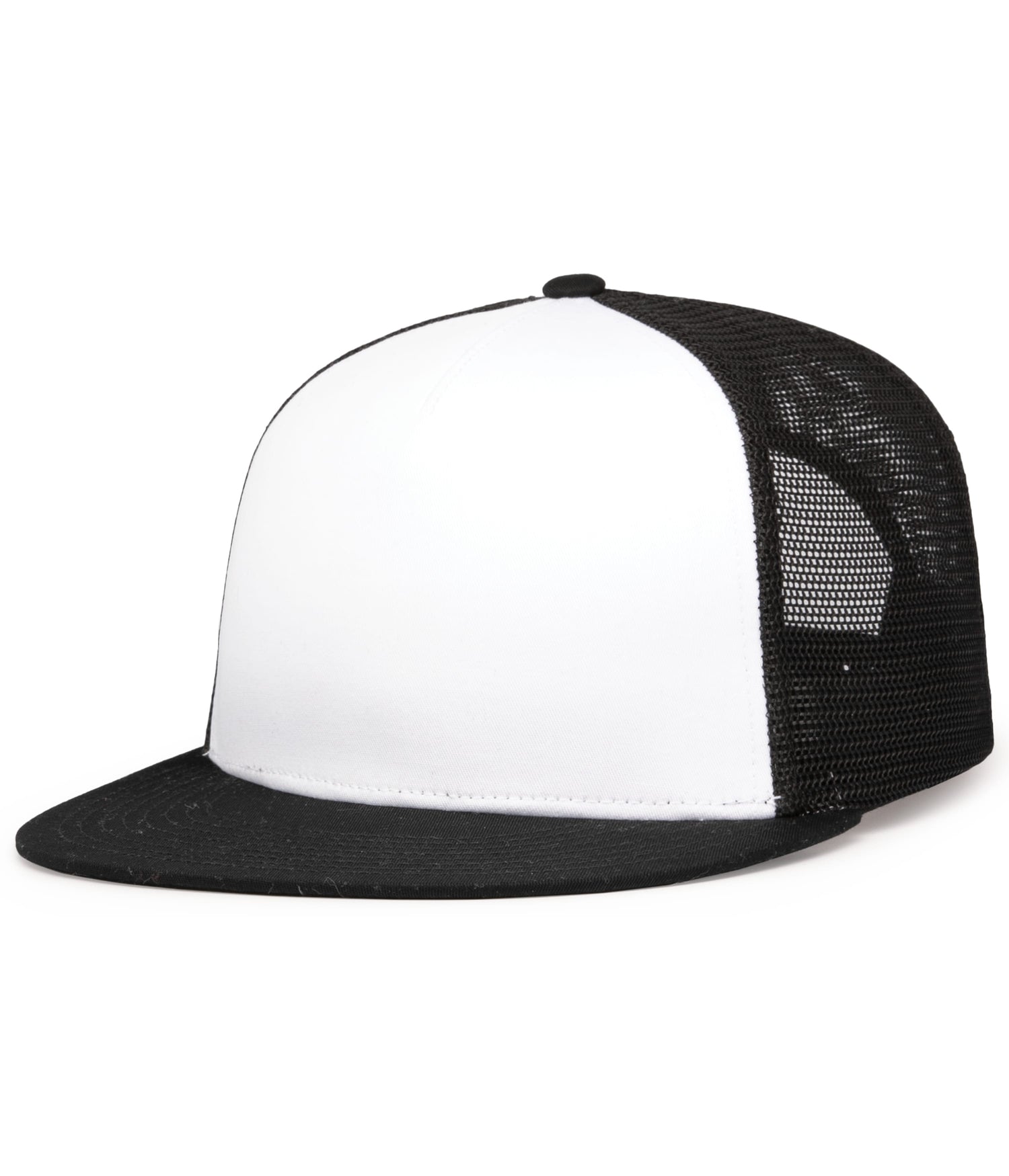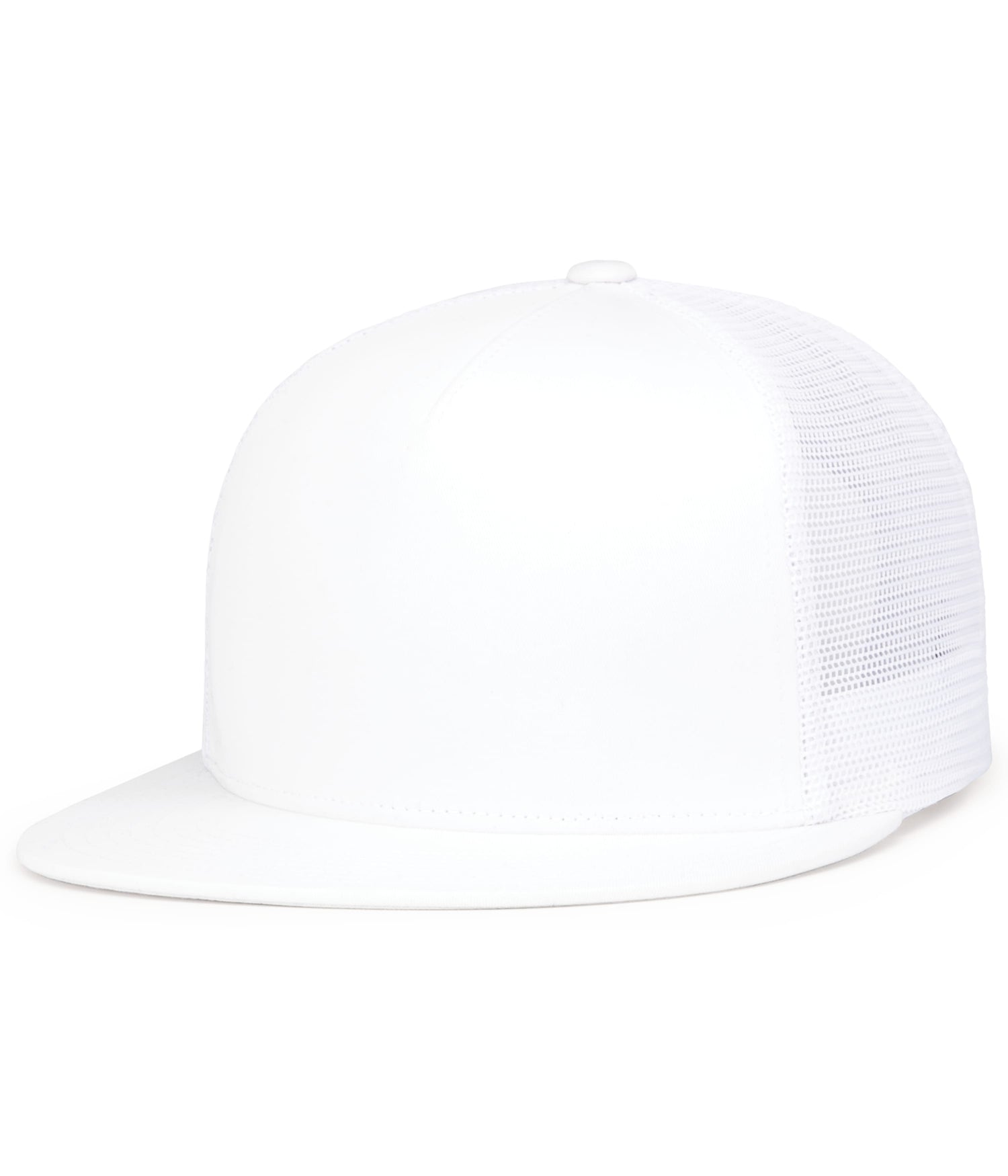 * Poly/cotton blend * Trucker mesh * Full-profile * 5-panel * Flat bill * Pro-stitched finish * Snapback adjustable