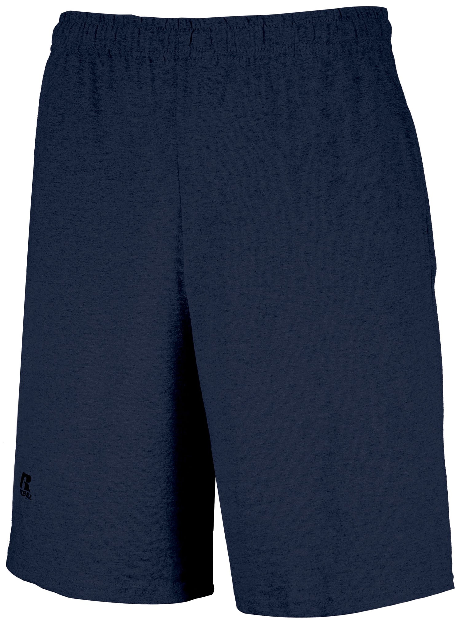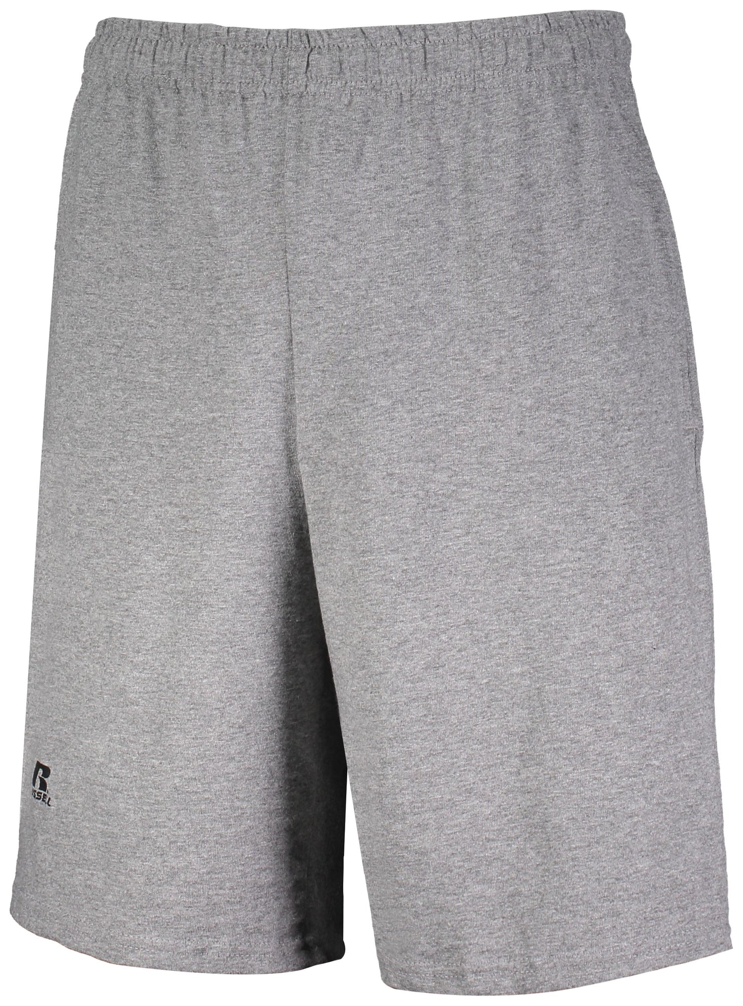 6.8 ounce * Colors: 100% cotton, * Black Heather: 50% cotton/50% polyester * Oxford: 53% polyester/47% cotton * "R RUSSELL" on right leg * Covered waistband with inside elastic drawcord * Side seam pockets * 8-inch inseam