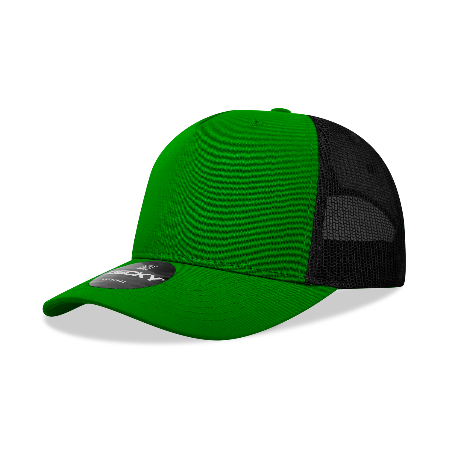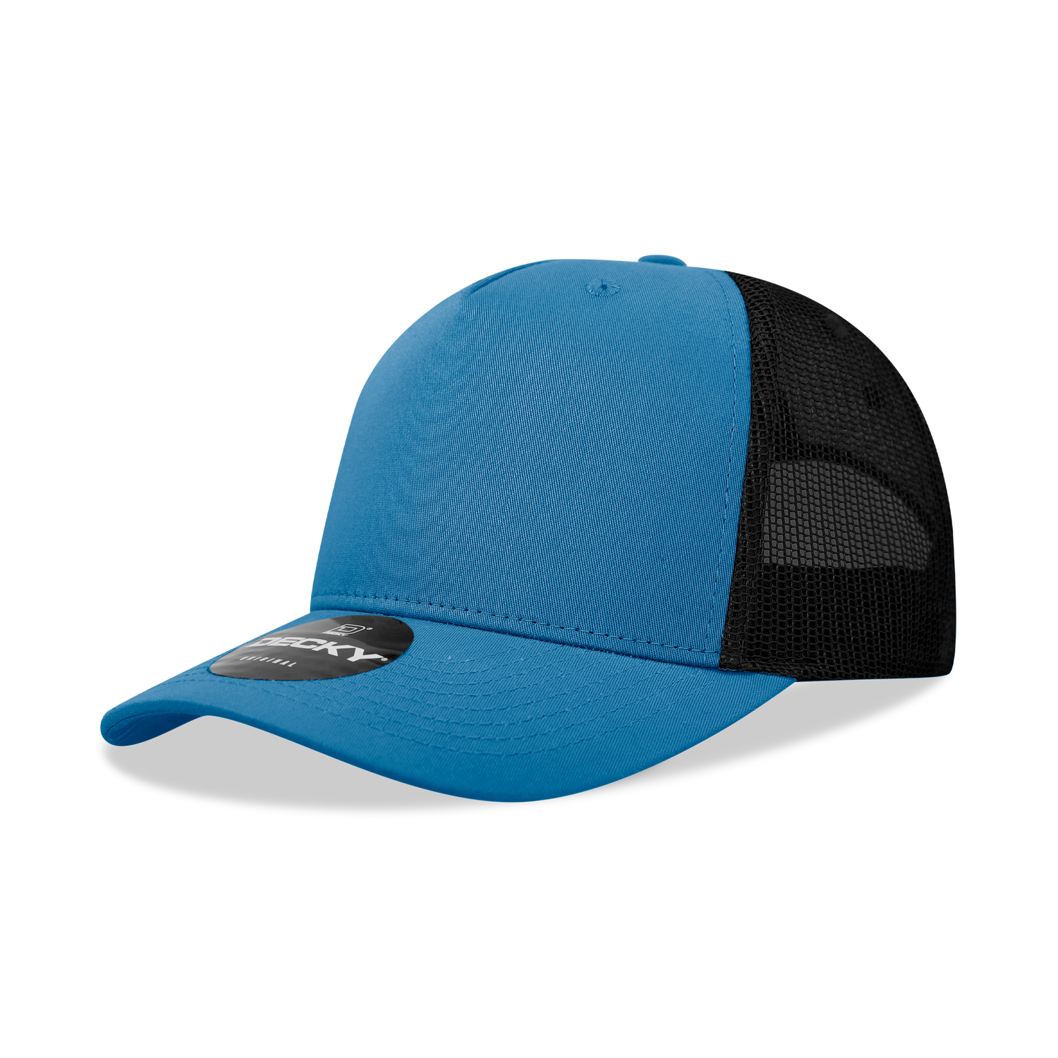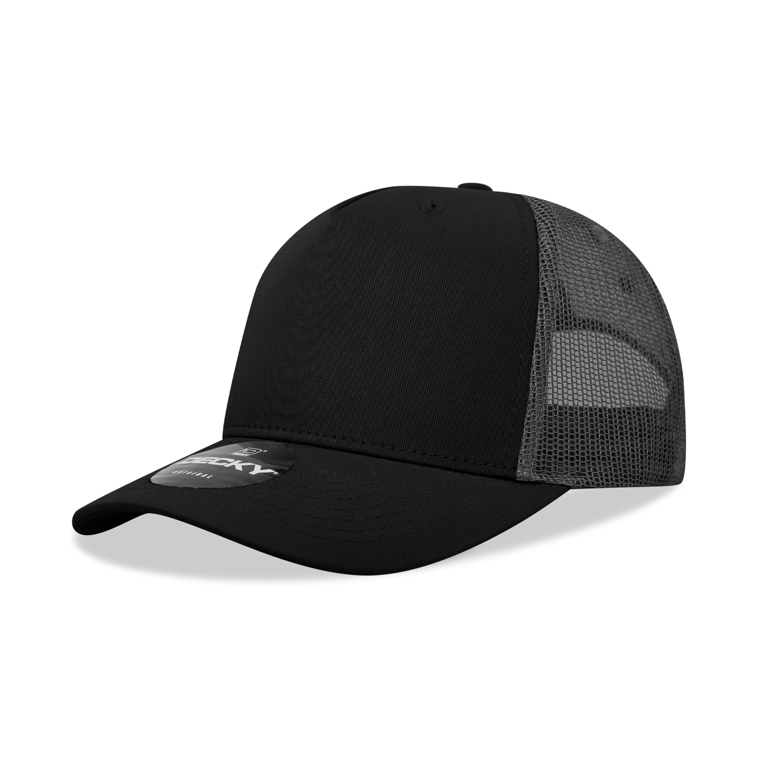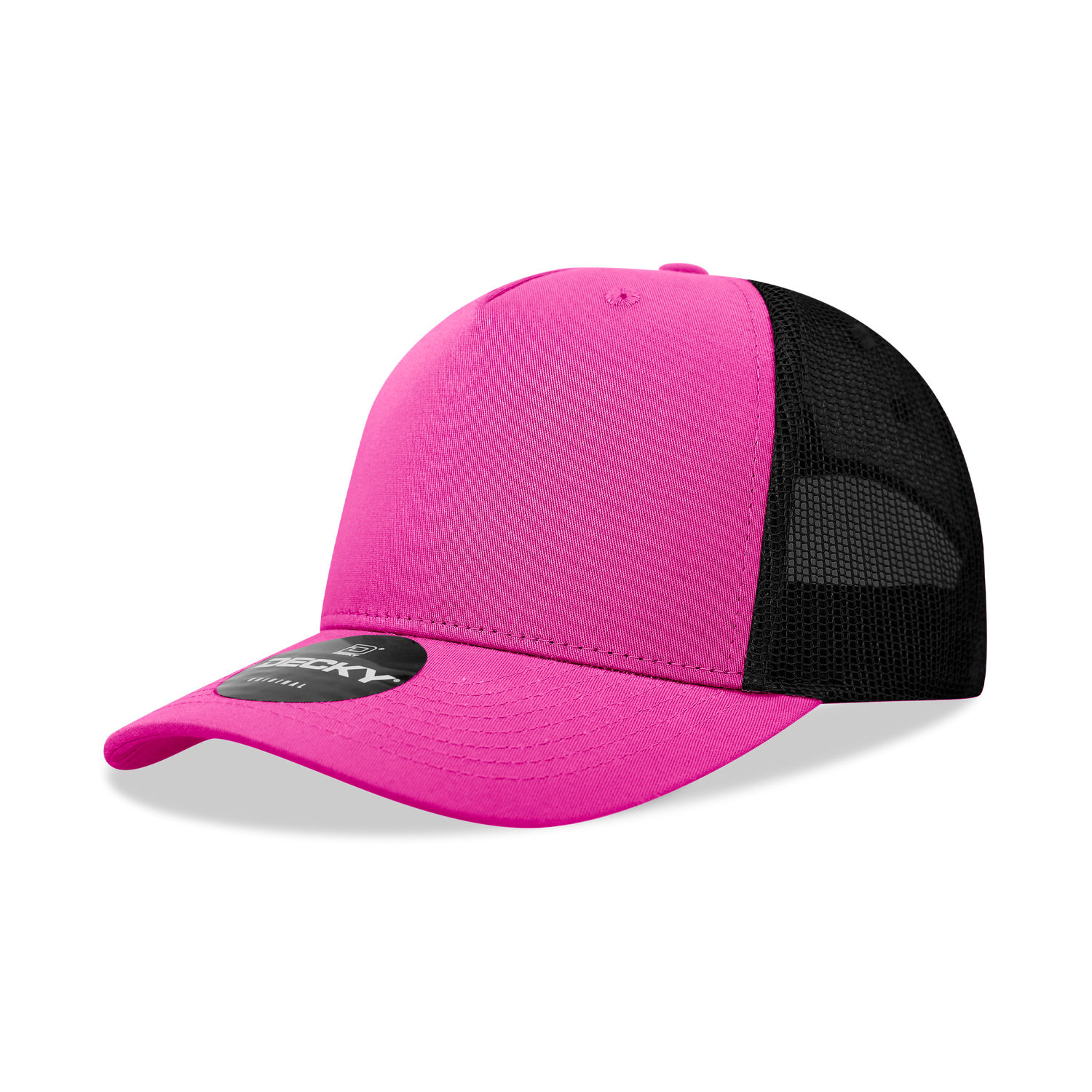 The Classic 5 Panel Retro Trucker hat features 1 solid front panel and 4 rear mesh panels. It has a cotton sweatband, a pre-curved bill and is finished with a plastic snap closure.