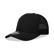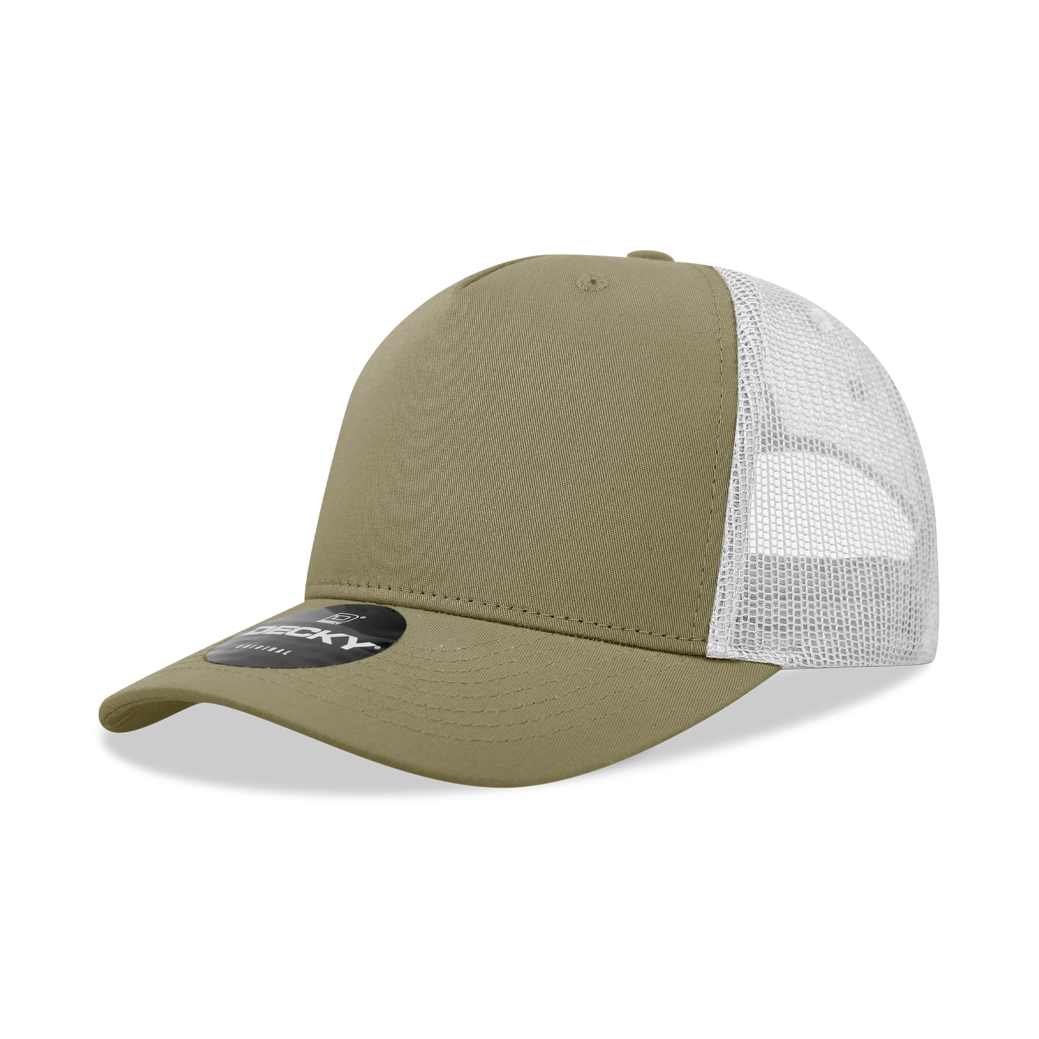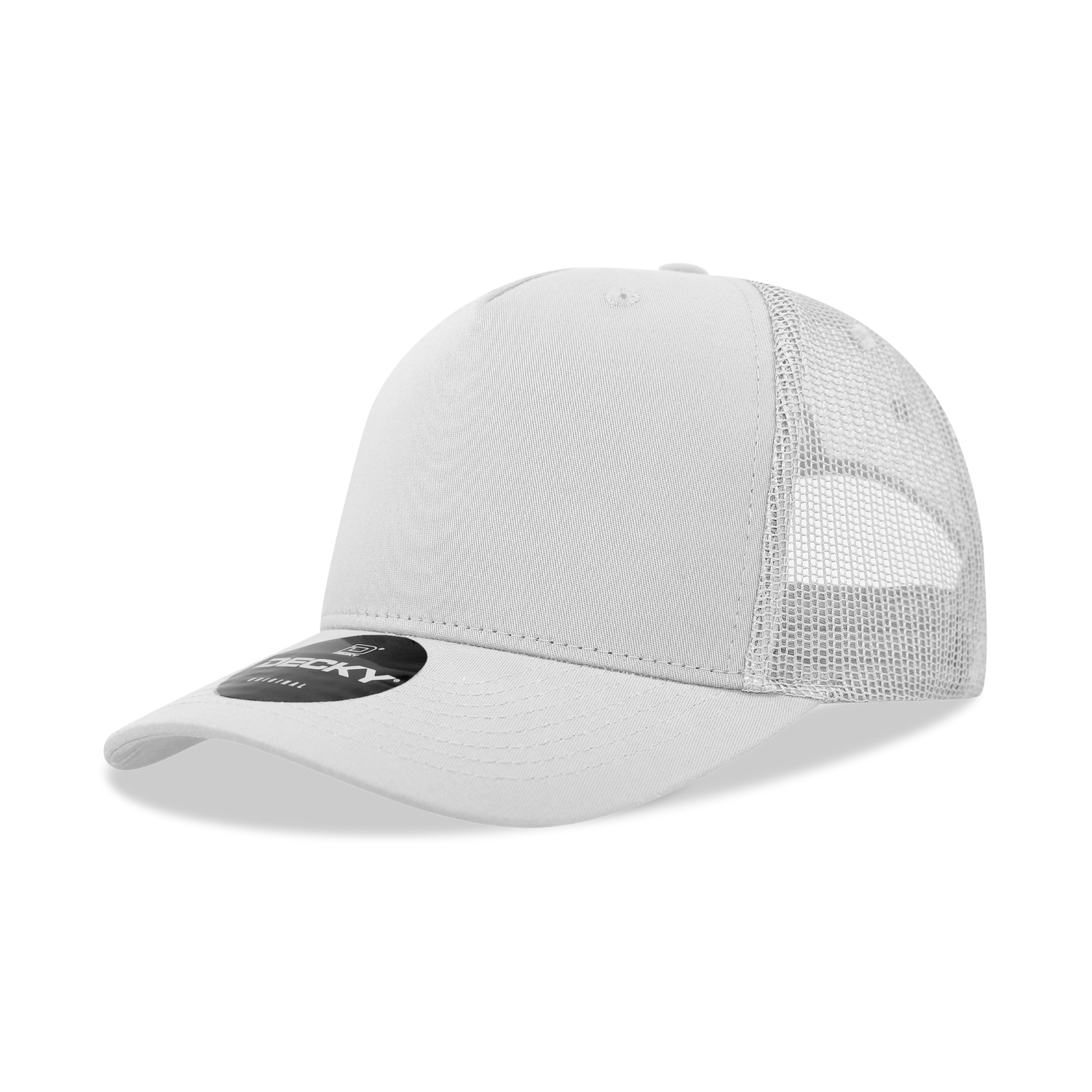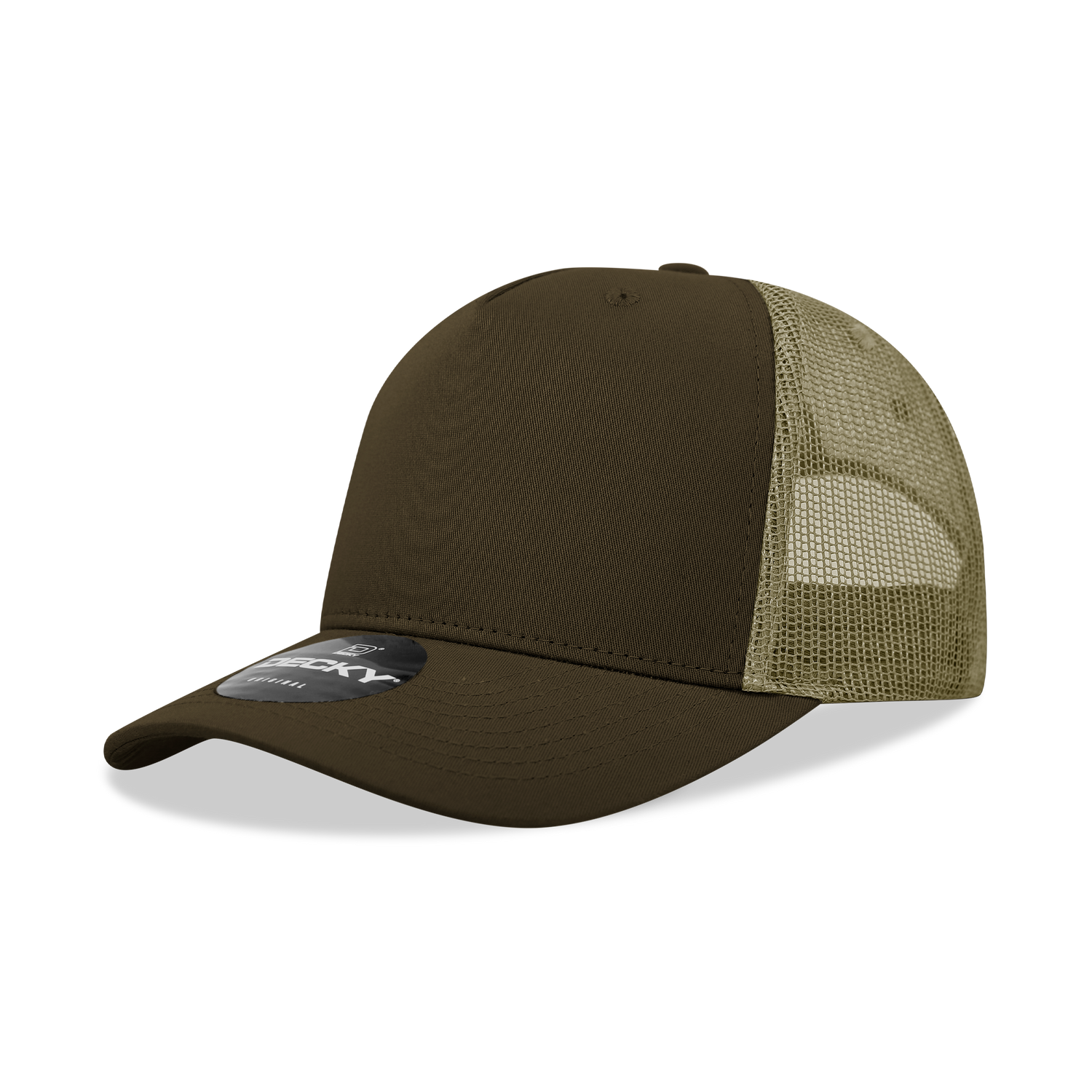 The Classic 5 Panel Retro Trucker hat features 1 solid front panel and 4 rear mesh panels. It has a cotton sweatband, a pre-curved bill and is finished with a plastic snap closure.