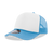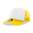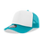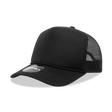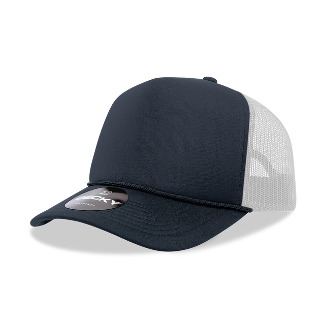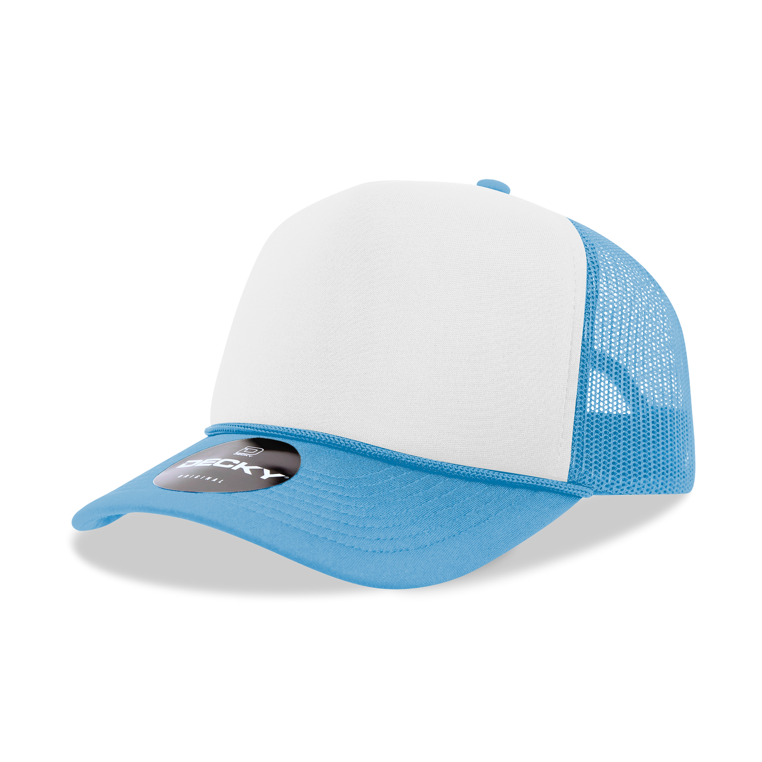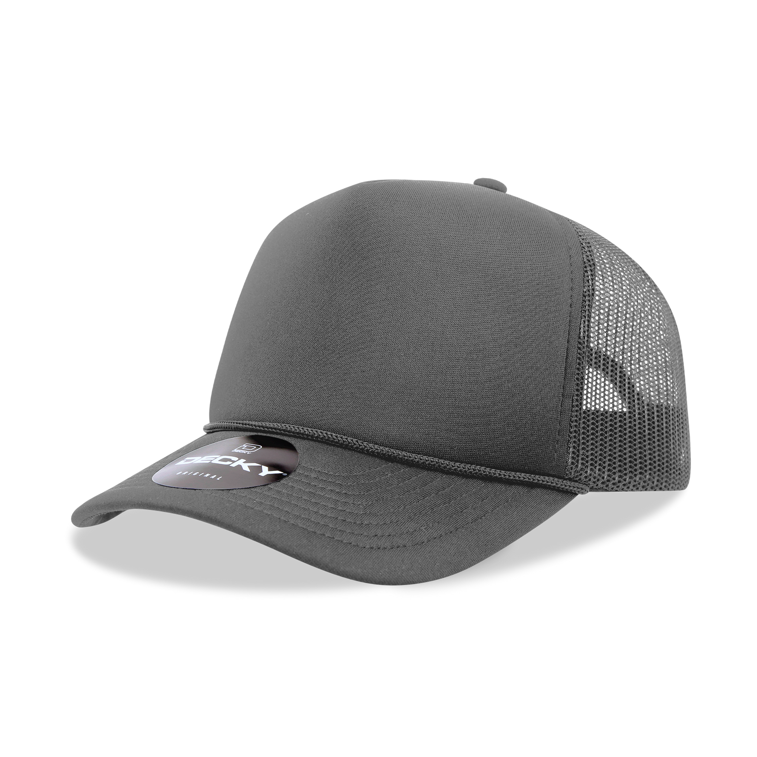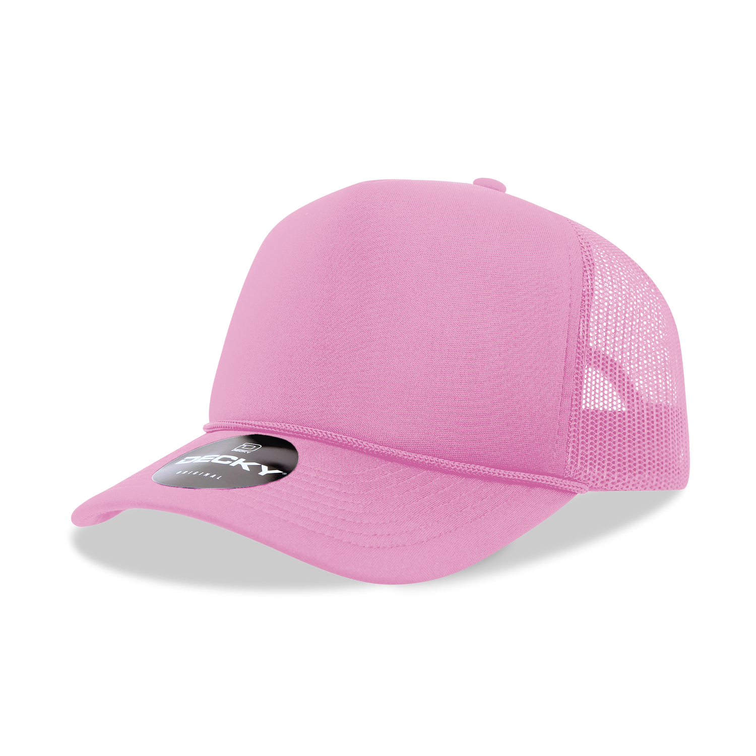 The Mid Profile 5 Panel Foam Trucker Hat is constructed with rear mesh panels and a foam front. It features an integrated cotton sweatband, a pre-curved bill, and an adjustable plastic snap closure.