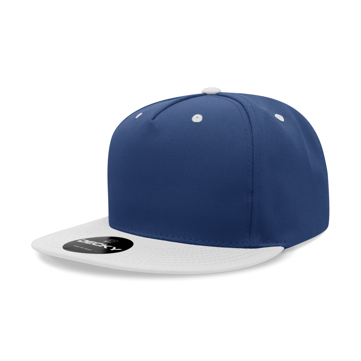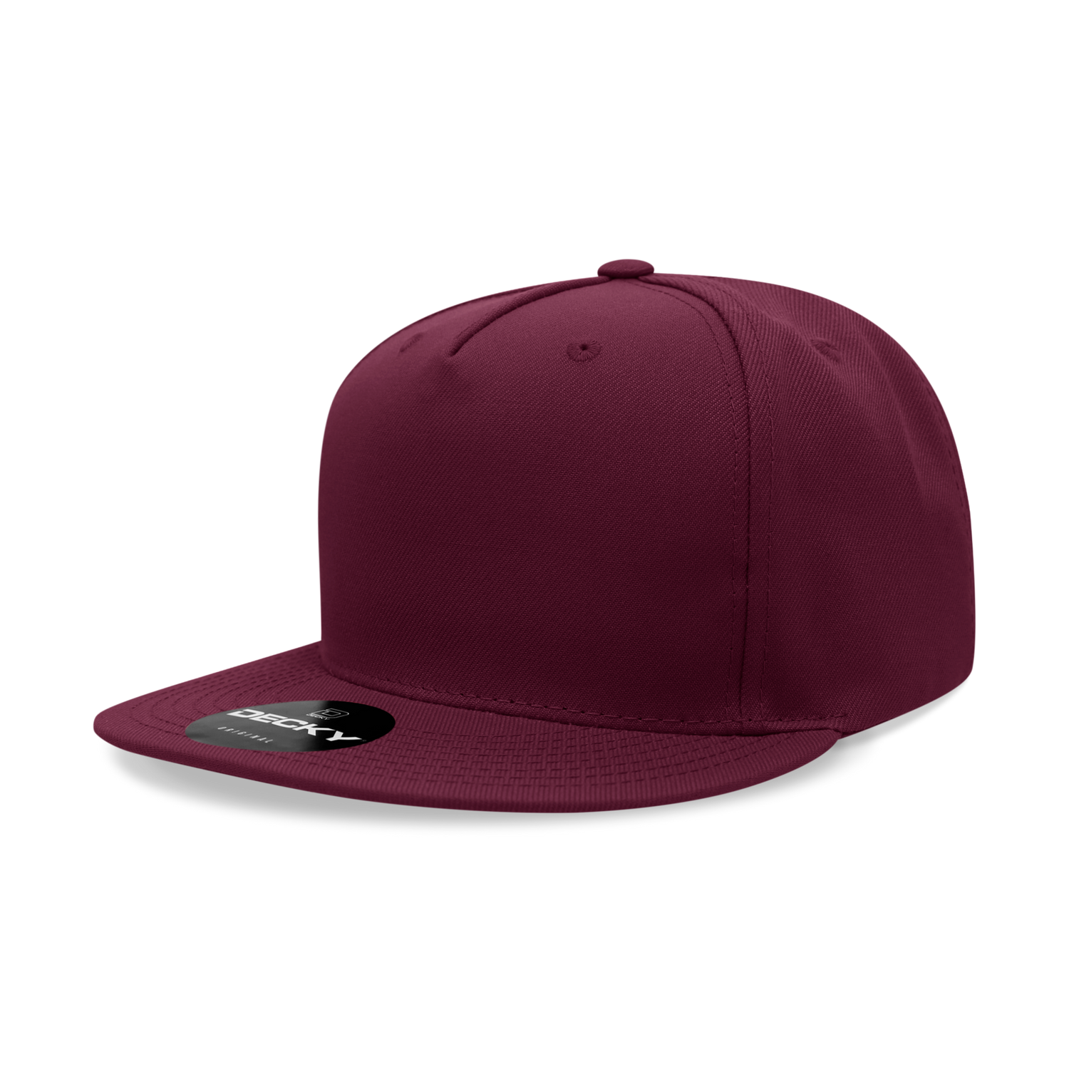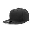 The 5 Panel Polyester Snapback is a constructed cap featuring a cotton sweatband, stitched eyelets, a retro flat bill and a plastic snap closure.