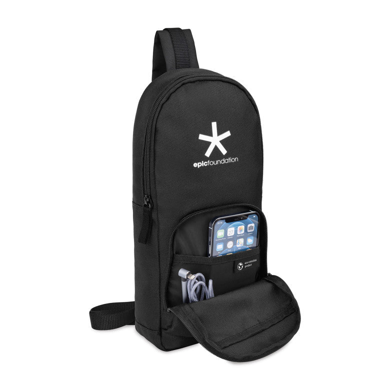 - A modern and eco-conscious update to a classic sling bag using recycled fabric and webbing made from plastic bottles