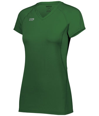 * 84% polyester/16% spandex knit with Coloright™ technology that helps prevent dye migration* 90% polyester/10% spandex wicking mesh underarm and sleeve inserts with color secure® technology that helps prevent dye migration * 4-Way stretch properties allow for increased mobility"" * Wicks moisture * Ladies' fit * Tag-free label * V-neck collar * Strategically placed seams for maximum mobility and comfort * Raglan sleeves * Designed to conform to NFHS specifications for a solid jersey