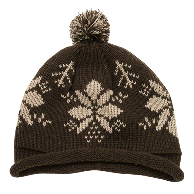 The Snowflake Roll Up Beanie w/ Pom Pom is a snug-fitting beanie featuring a snowflake pattern, rolled cuff, and two-tone pom pom.